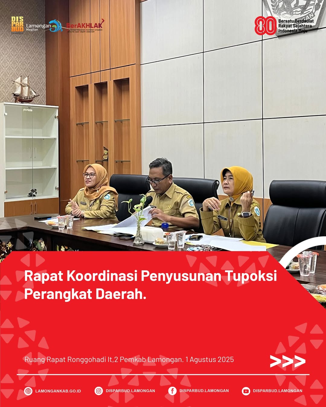 Sebagai langkah strategis dalam mendukung efektivitas kinerja pemerintahan daerah, Pemkab Lamongan menggelar Rapat Koordinasi Penyusunan Tugas Pokok dan Fungsi (Tupoksi) Perangkat Daerah yang berlangsung pada Jumat (1/8) di Ruang Rapat Ronggohadi.