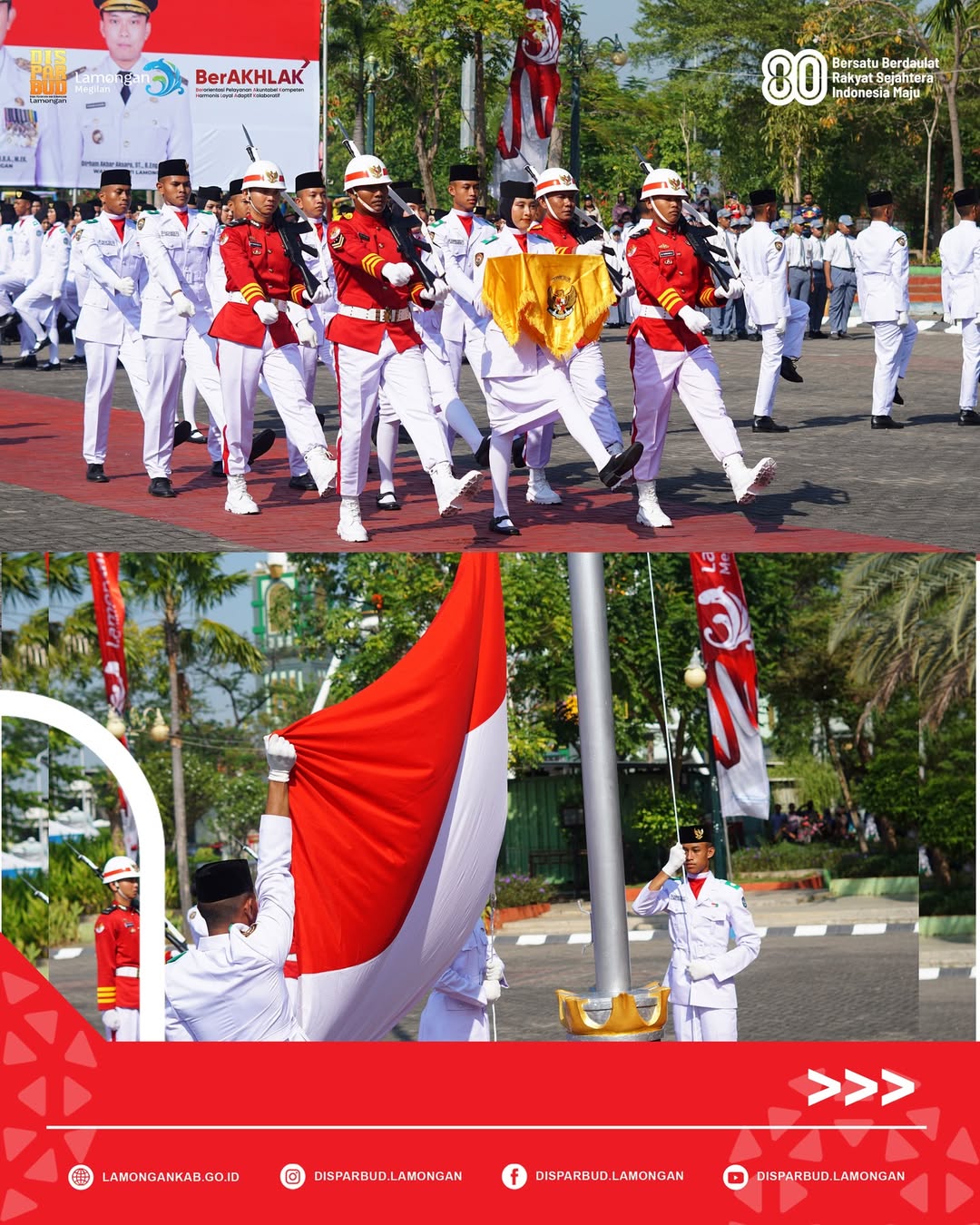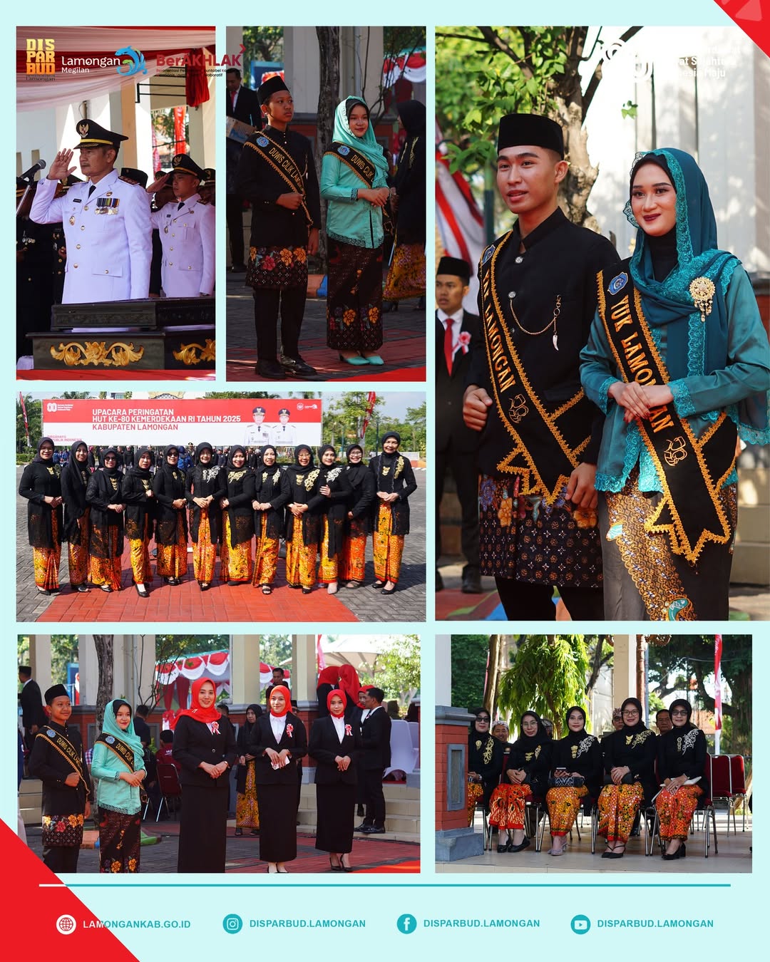 Ibu Kepala Dinas Pariwisata dan Kebudayaan Kabupaten Lamongan turut hadir dalam Upacara Peringatan Hari Ulang Tahun (HUT) ke-80 Kemerdekaan RI yang berlangsung di Alun-alun Kota Lamongan, Minggu (17/8) pagi. Upacara berjalan khidmat dan sukses dengan pasukan Paskibraka yang berhasil mengibarkan Sang Saka Merah Putih dengan lancar. Bertindak sebagai Inspektur Upacara Bupati Lamongan, Yuhronur Efendi, serta dihadiri jajaran Forkopimda Lamongan.Semarak upacara semakin meriah dengan hadirnya Duta Wisata Cilik Lamongan dan Yak Yuk Lamongan, yang menambah semangat generasi muda dalam memperkokoh rasa nasionalisme dan cinta tanah air