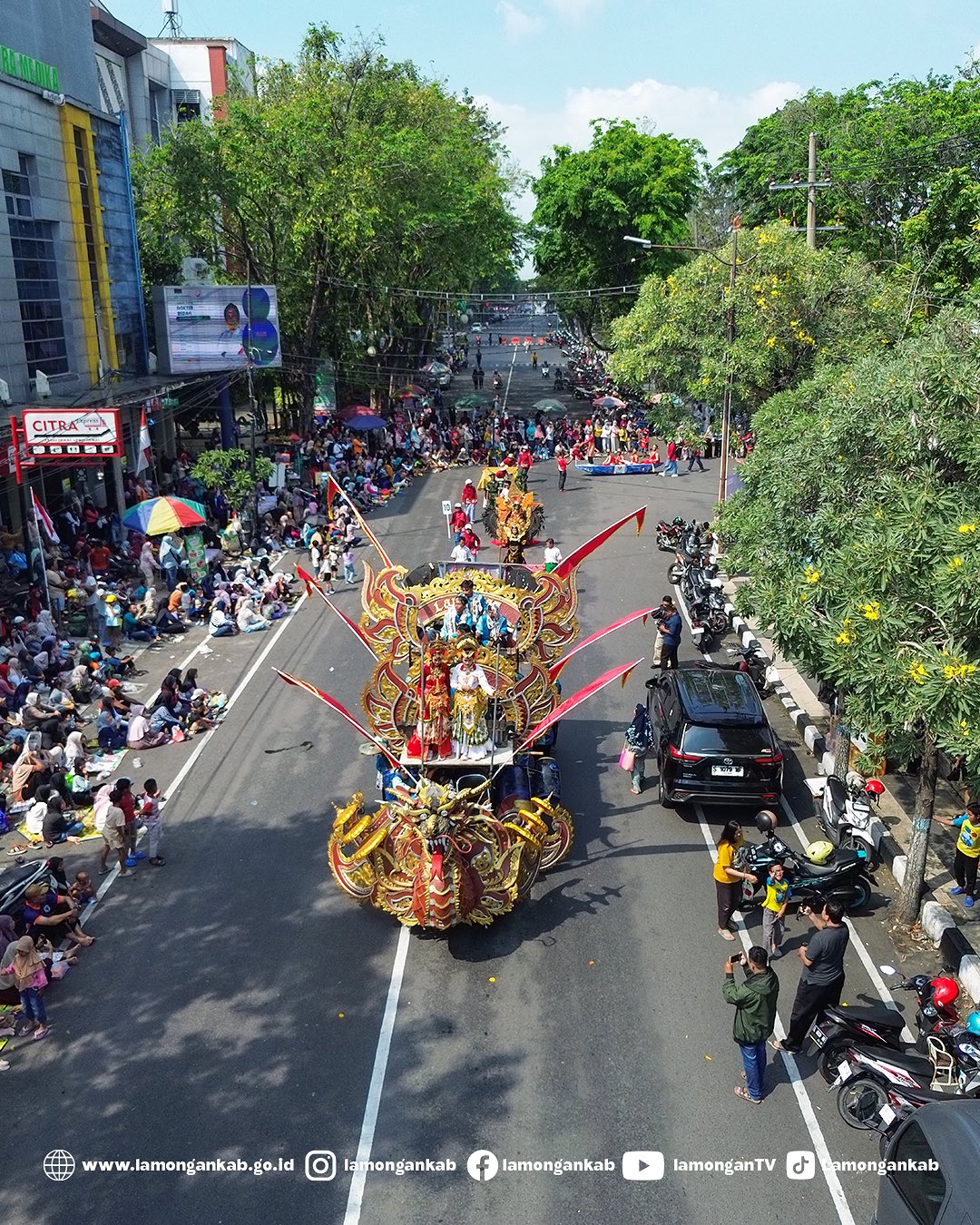 Mengambil rute, Depan Pendopo - Jl. Lamongrejo Jl. Wahidin SH-JI. Soewoko JI. KH. Ahmad Dahlan - Jl. Sunan Drajad - Jalan Sumargo - sampai Lapangan Gajah Mada, masyarakat tumpah ruah menyaksikan parade penuh warna. Busana adat, marching band, tarian tradisional, replika bangunan dan karakter, hingga cosplay modern berpadu menjadi gambaran nyata keberagaman Indonesia.