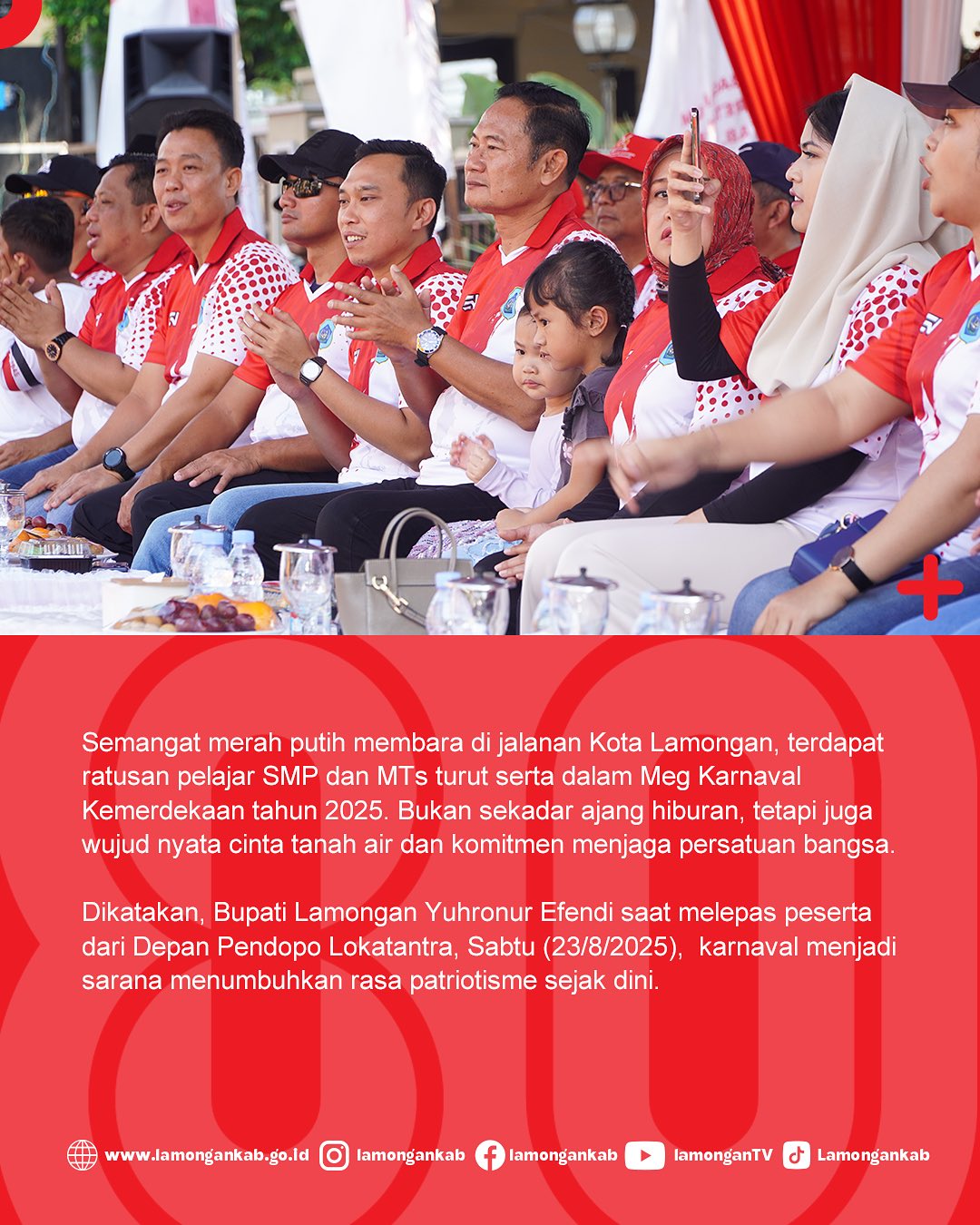 Dikatakan, Bupati Lamongan Yuhronur Efendi saat melepas peserta dari Depan Pendopo Lokatantra, Sabtu (23/8/2025), karnaval menjadi sarana menumbuhkan rasa patriotisme sejak dini.