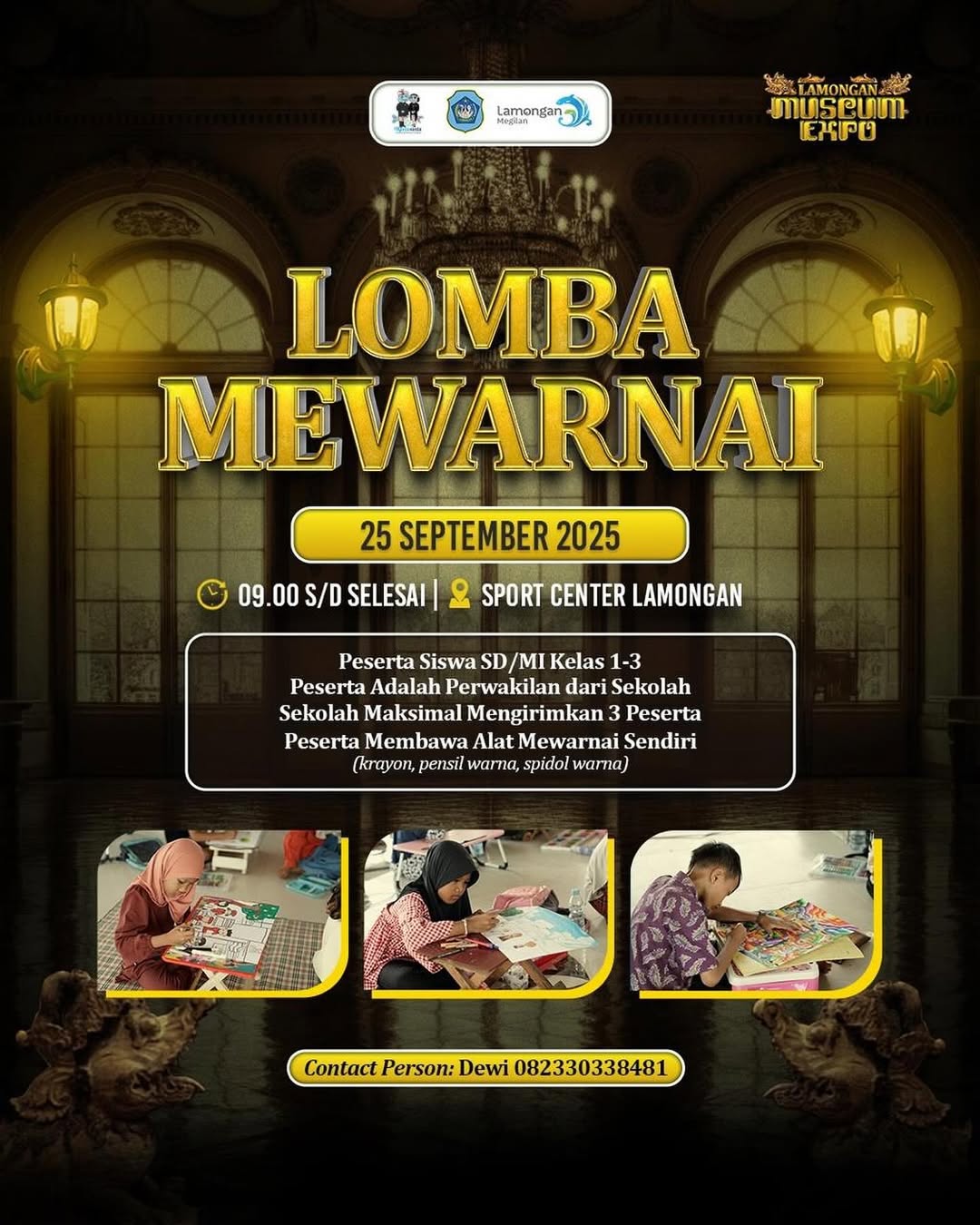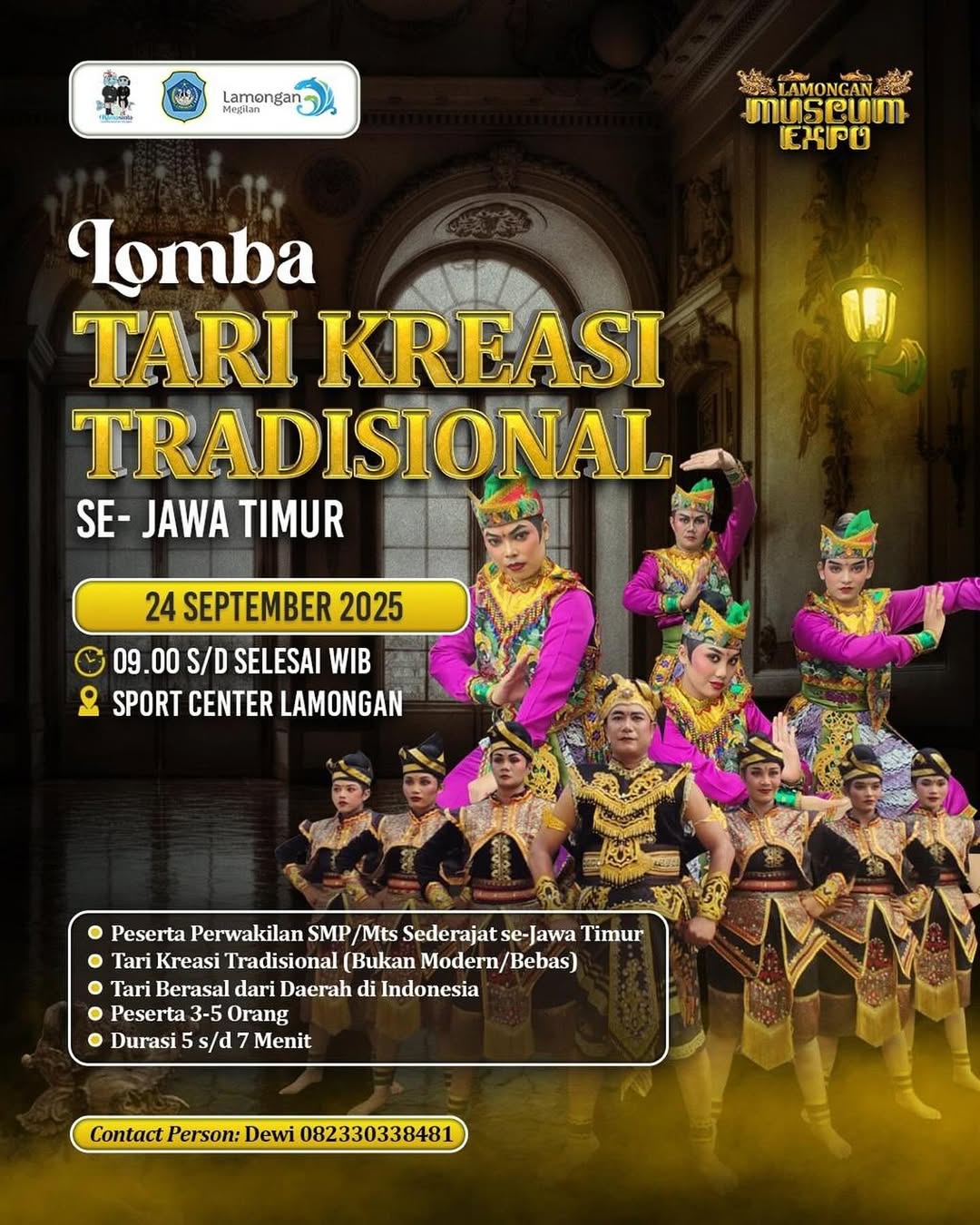 Bersiaplah untuk merasakan serunya pameran budaya yang penuh inspirasi! ✨ Dengan tema “Museum Alive: Dari Koleksi Jadi Inspirasi”, akan ada: 🎨 Pameran Koleksi Museum Nusantara 💃 Lomba Tari Kreasi Tradisional 🖌️ Lomba Mewarnai 🎭 Pentas Seni Tradisional 🔥 Highlight Lomba 🔥 ✨ Tari Kreasi Tradisional Se-Jawa Timur 📅 24 September 2025 | Peserta SMP/MTs sederajat 👥 Tim 3–5 orang | Durasi 5–7 menit ✨ Lomba Mewarnai SD/MI Kelas 1–3 📅 25 September 2025 | Perwakilan sekolah (maks. 3 peserta) ✏️ Membawa alat mewarnai sendiri 📞 Info & Pendaftaran: Dewi – 082330338481 📢 Catat tanggalnya dan ajak temanmu!Mari ramaikan Lamongan Museum Expo 2025 🎉