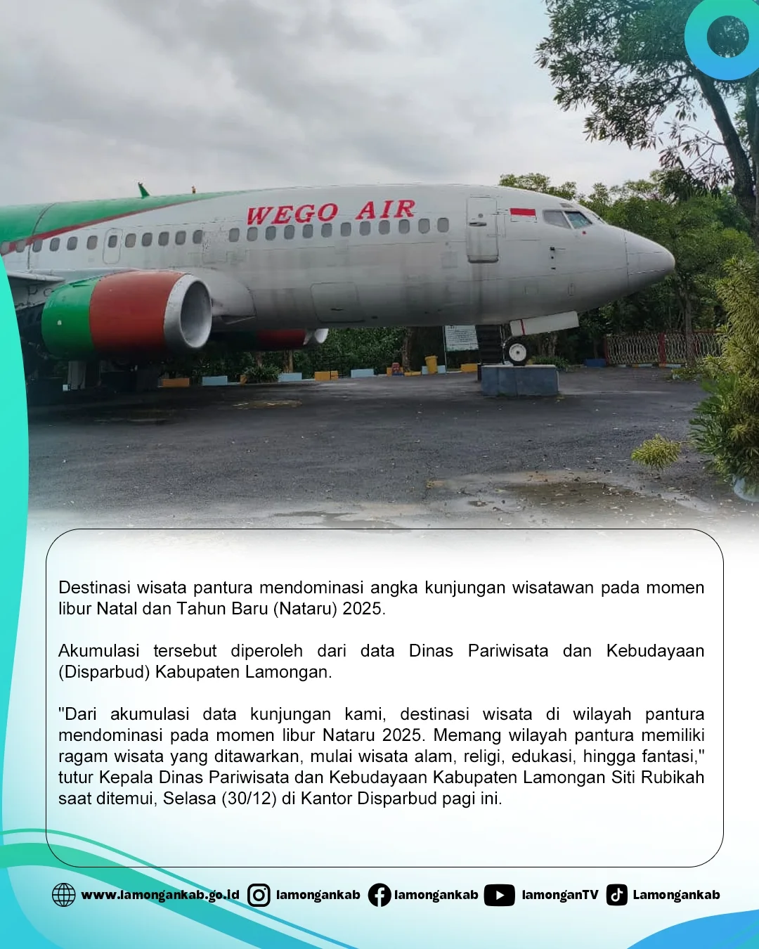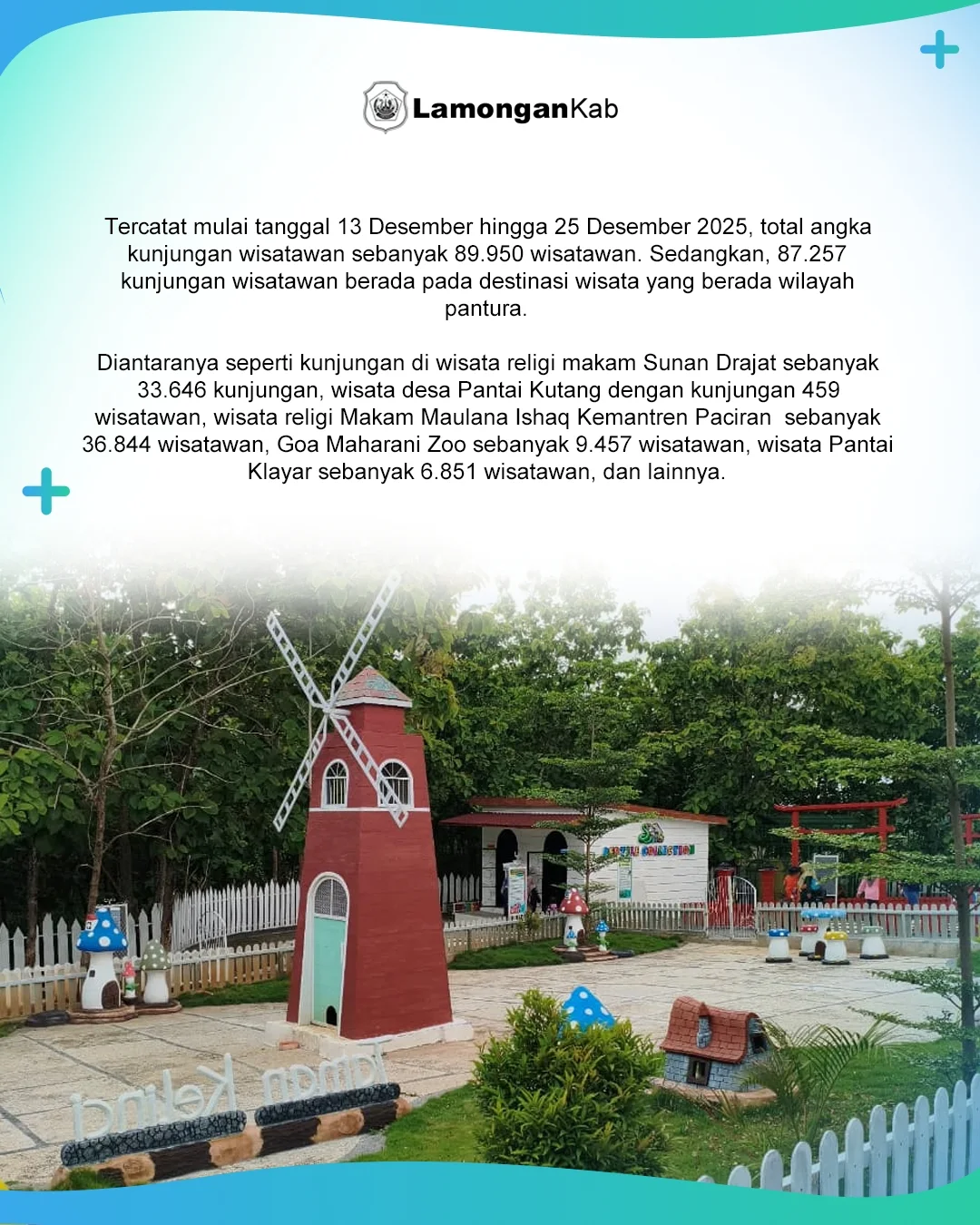 "Dari akumulasi data kunjungan kami, destinasi wisata di wilayah pantura mendominasi pada momen libur Nataru 2025. Memang wilayah pantura memiliki ragam wisata yang ditawarkan, mulai wisata alam, religi, edukasi, hingga fantasi," tutur Kepala Dinas Pariwisata dan Kebudayaan Kabupaten Lamongan Siti Rubikah saat ditemui, Selasa (30/12) di Kantor Disparbud pagi ini.